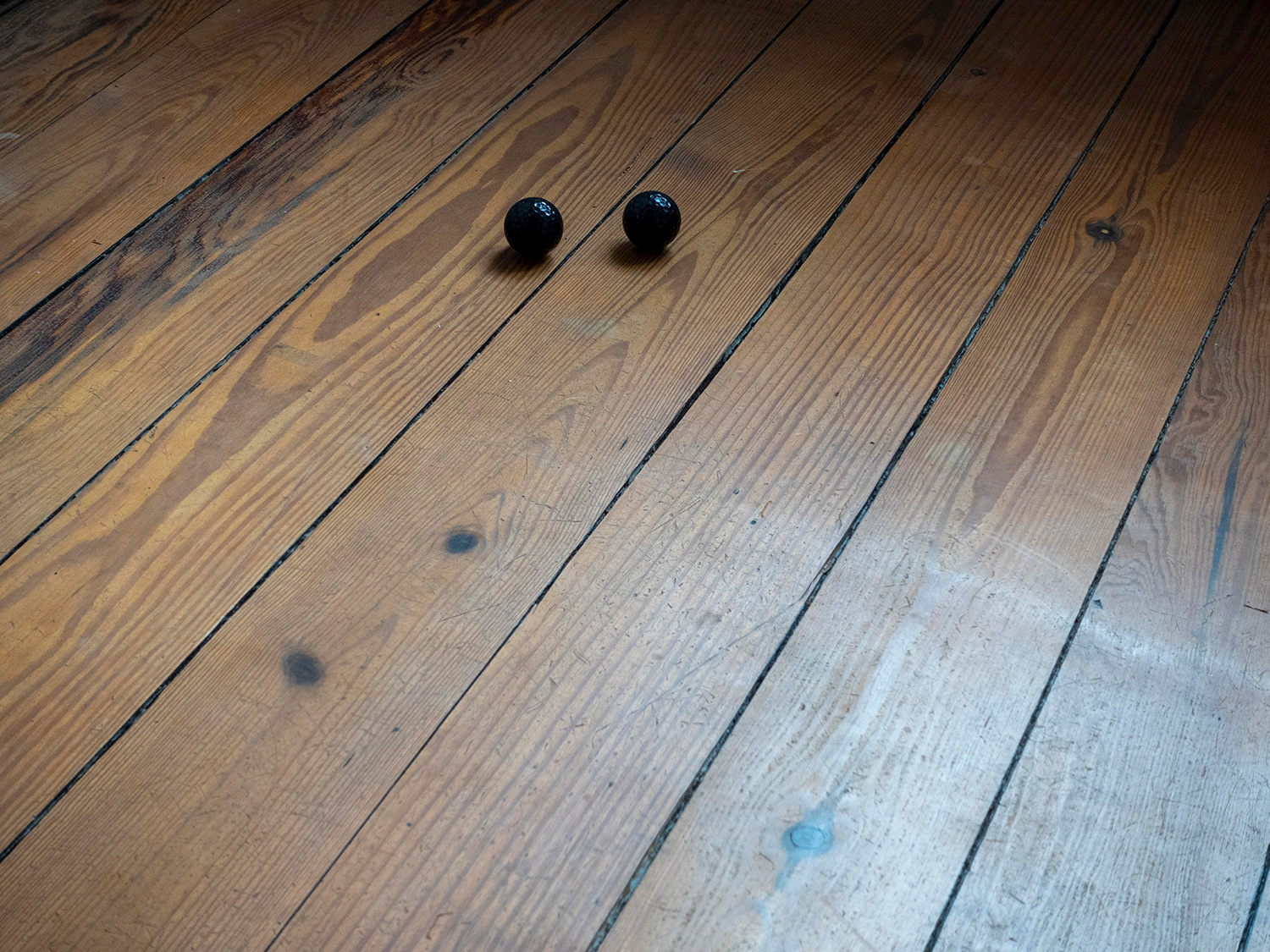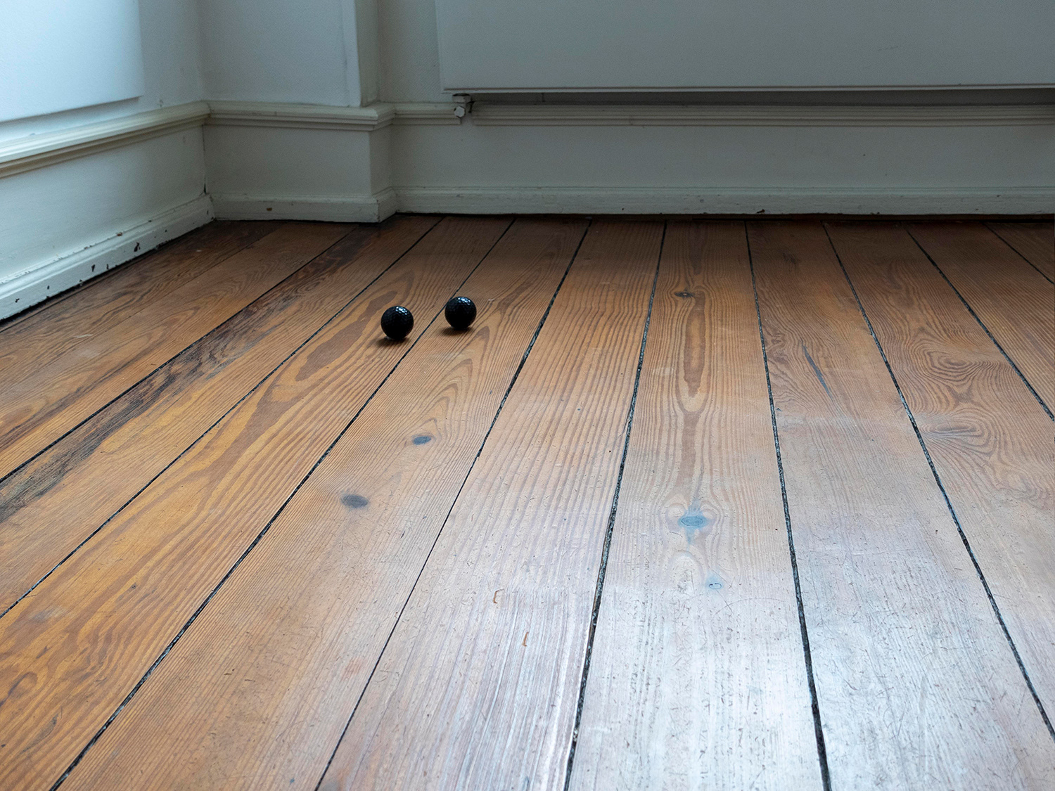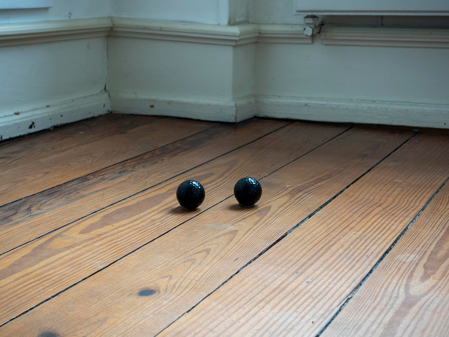2 black golf balls in a distance of approximately 10 cm in an otherwise empty space.