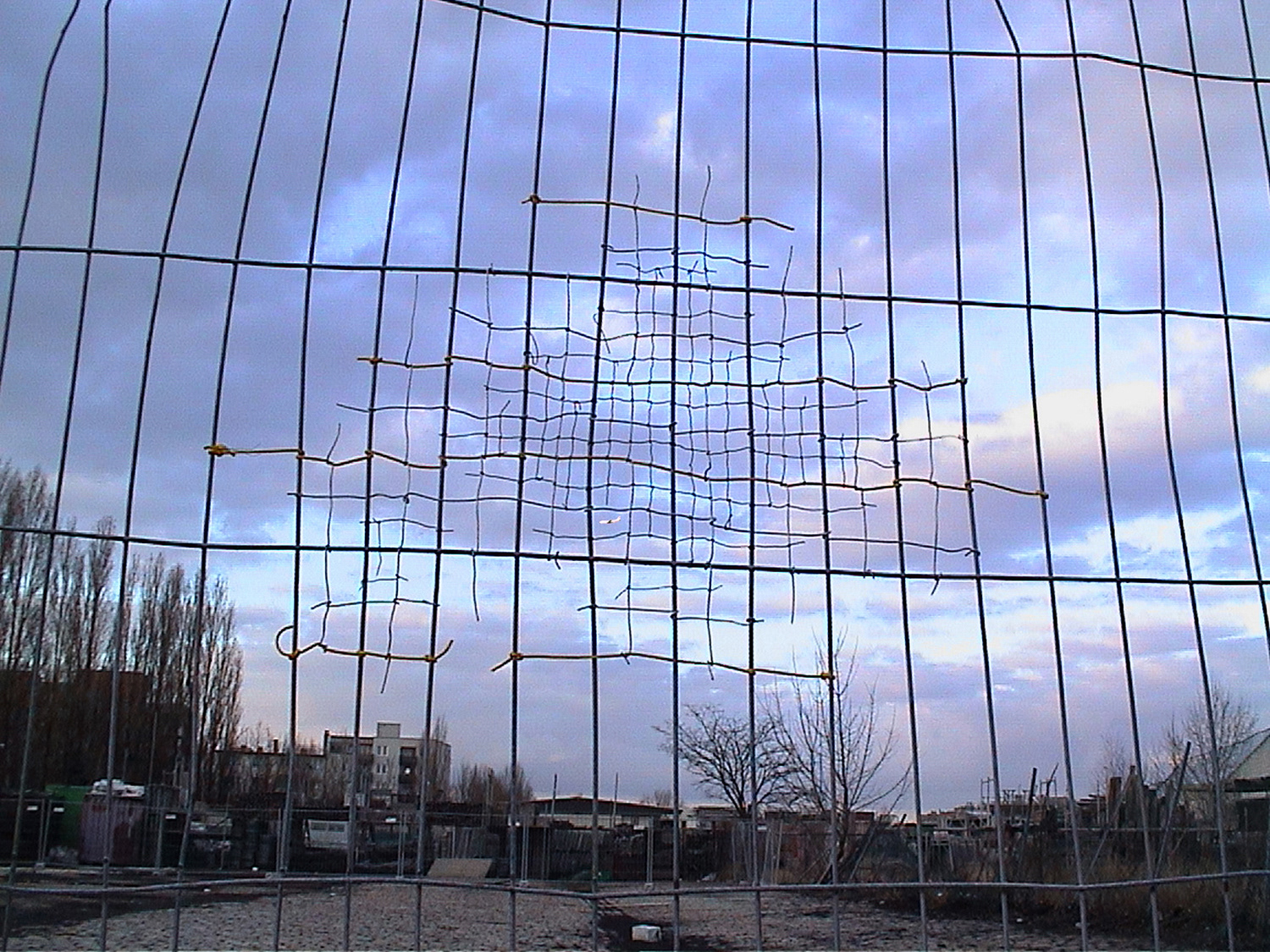 Threads of wire woven into a construction fence repeating its structure on an ever smaller scale.