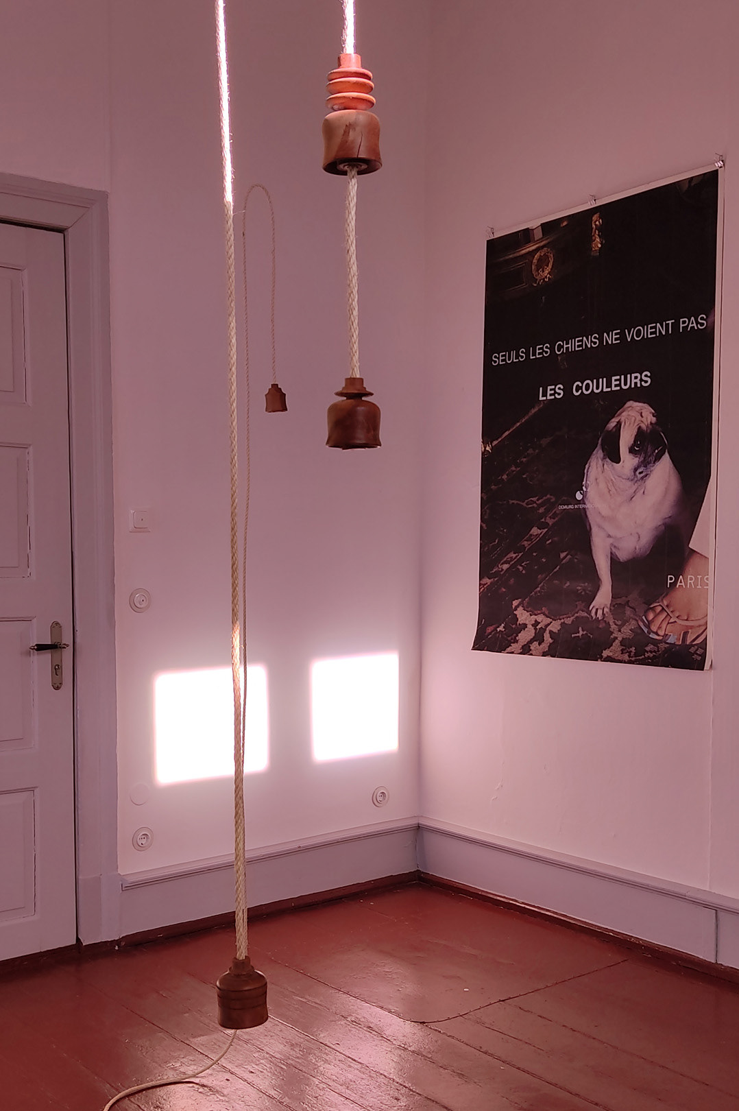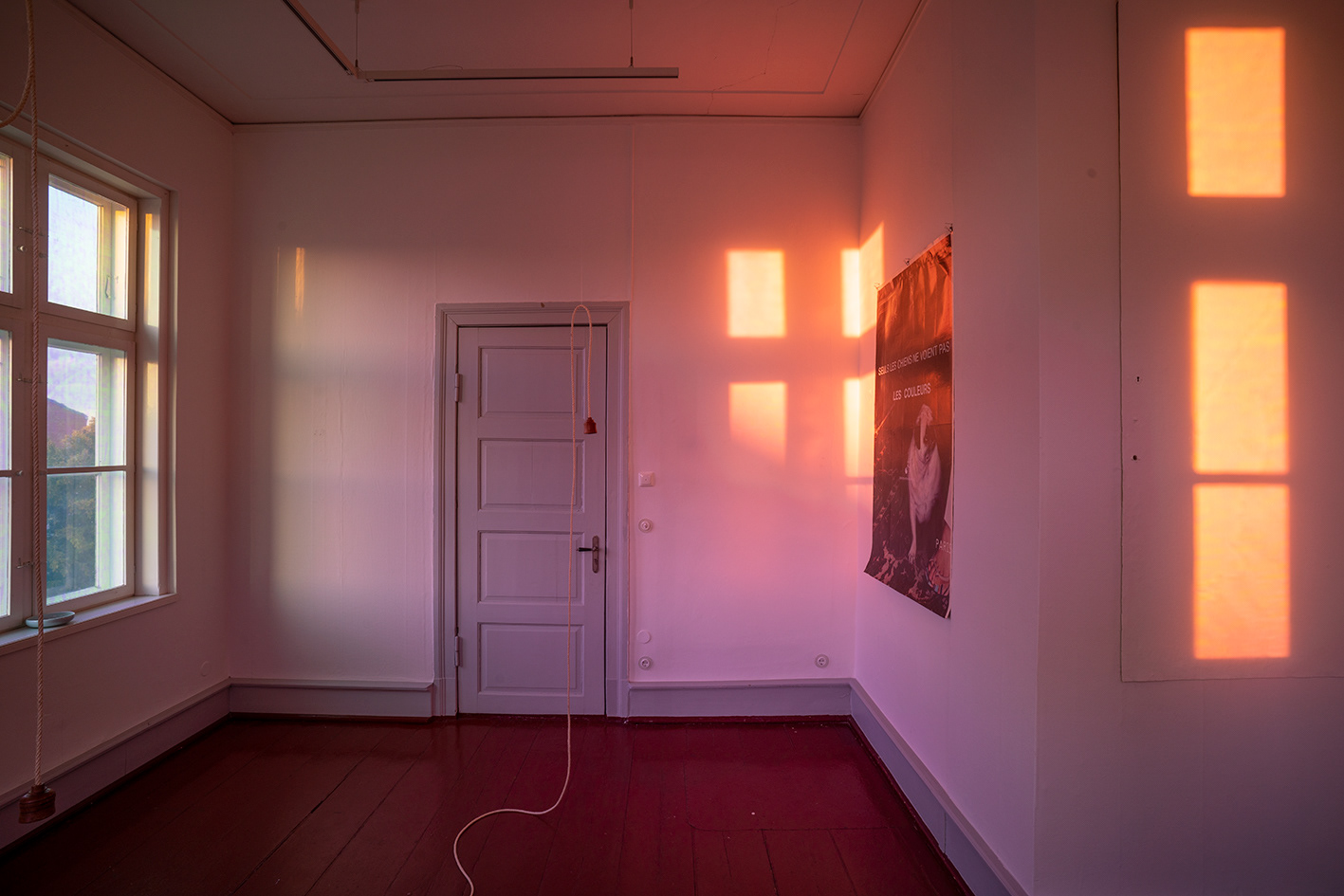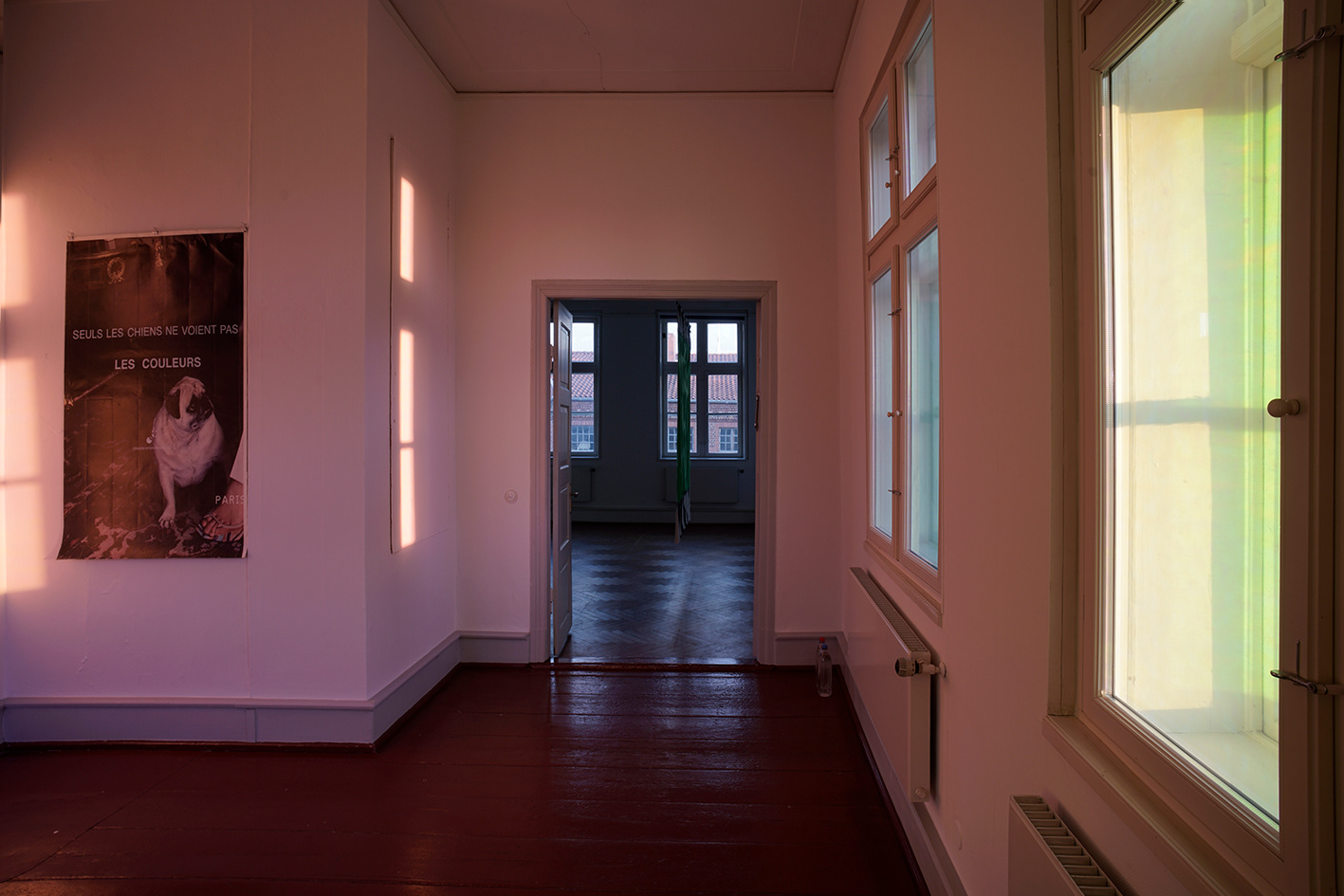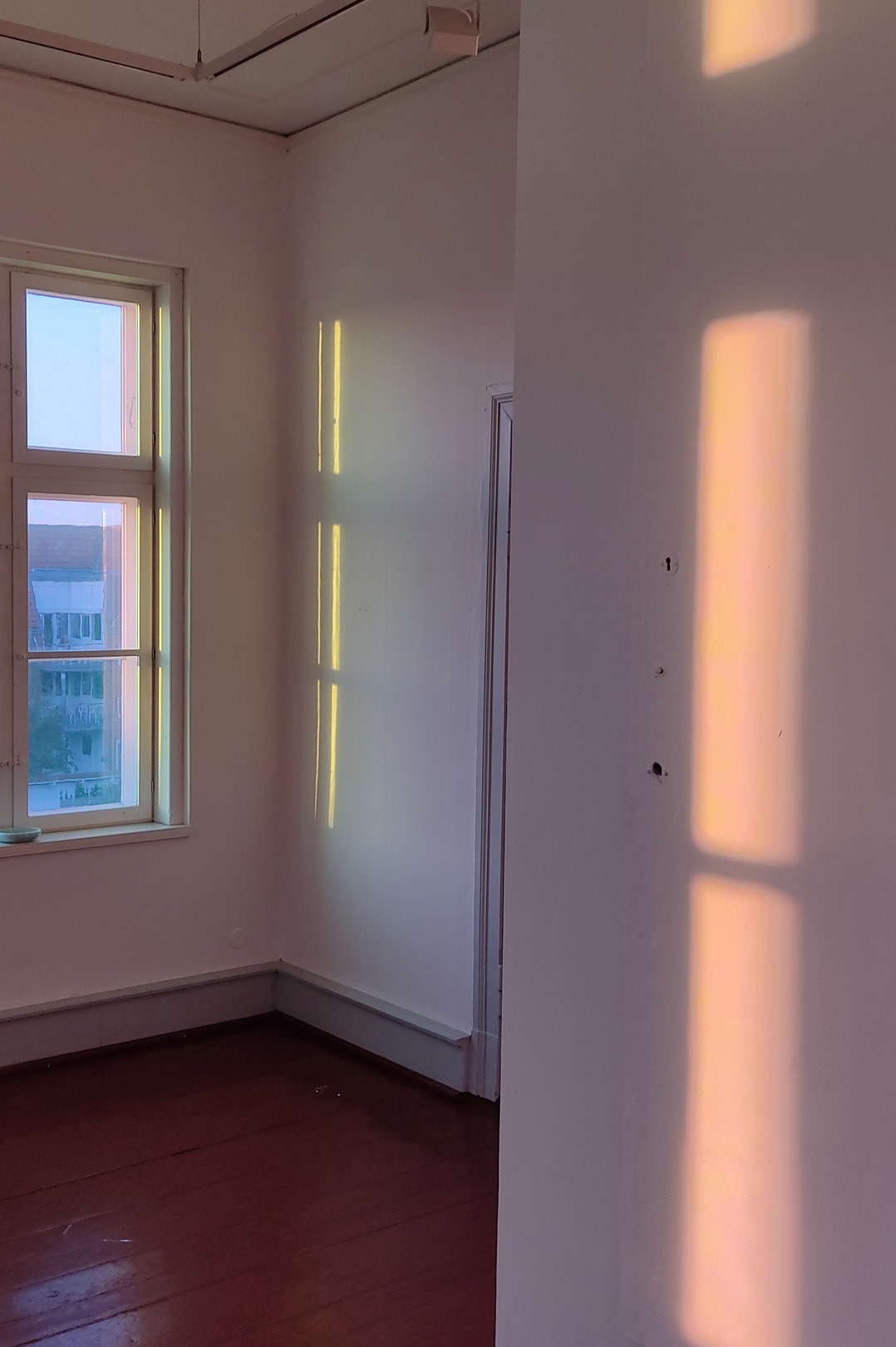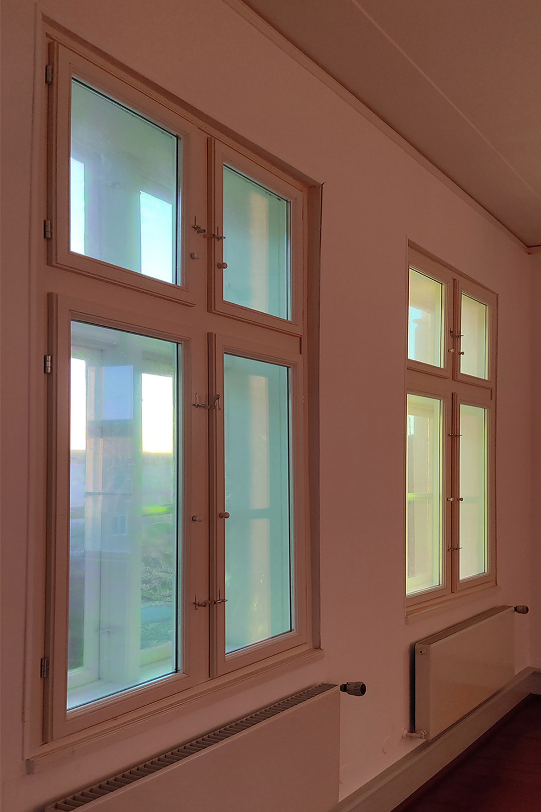 Room that has its windows covered with iridescent film. Depending on light conditions outside the space assumes a hue of purple or green.