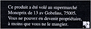 "This product was stolen in supermarket A (name adress). Therefore you cannot become owner of it unless you eat it."