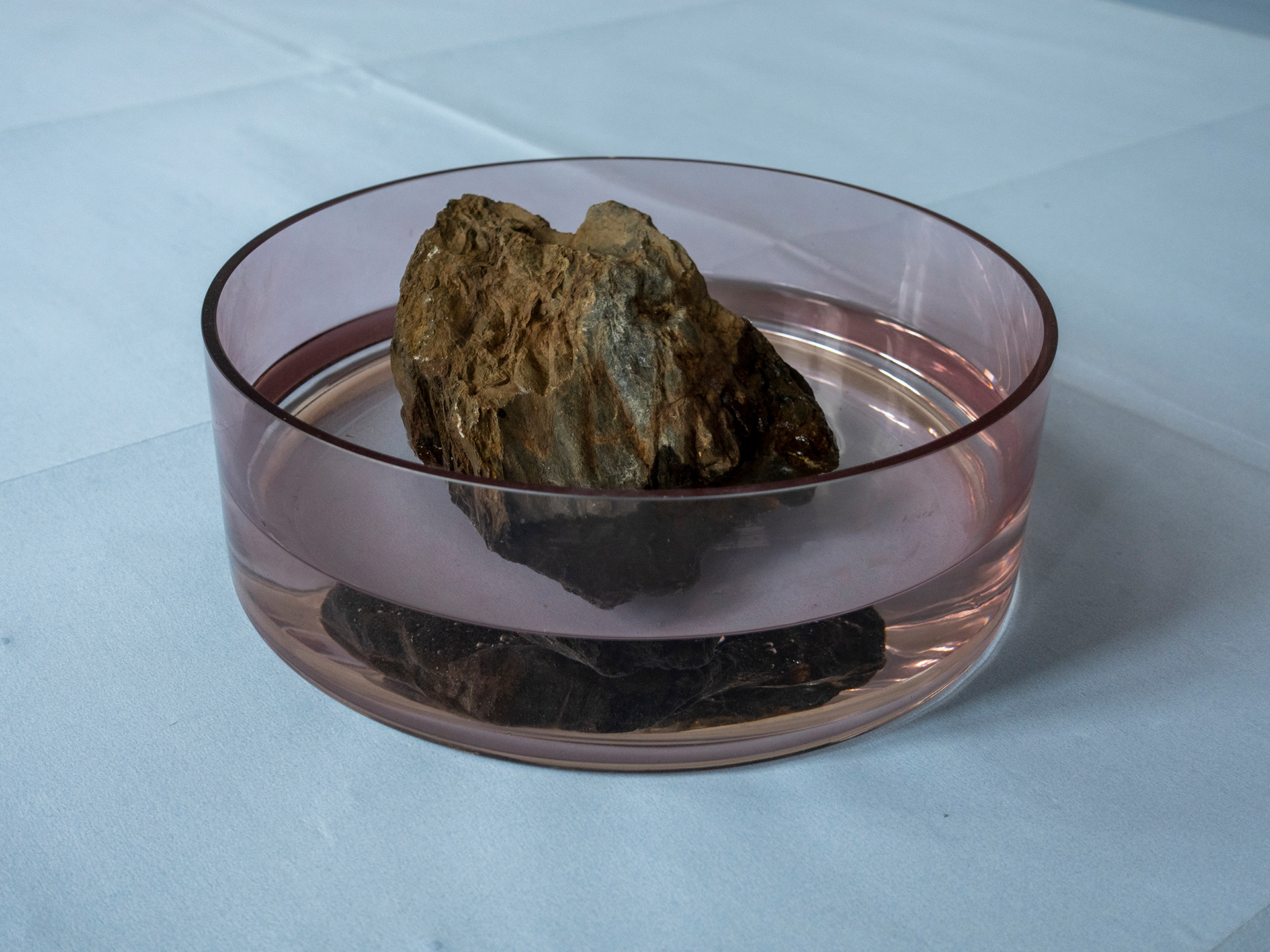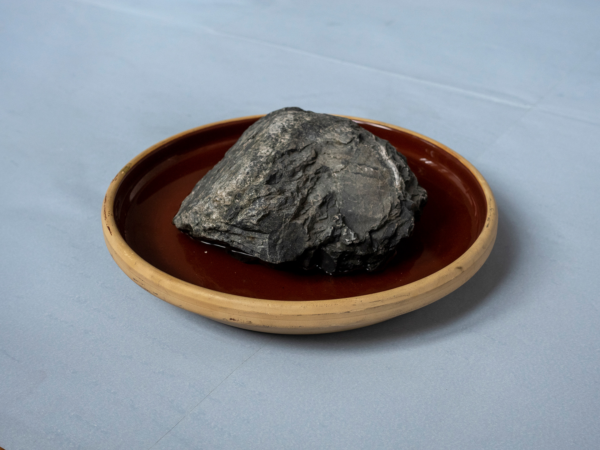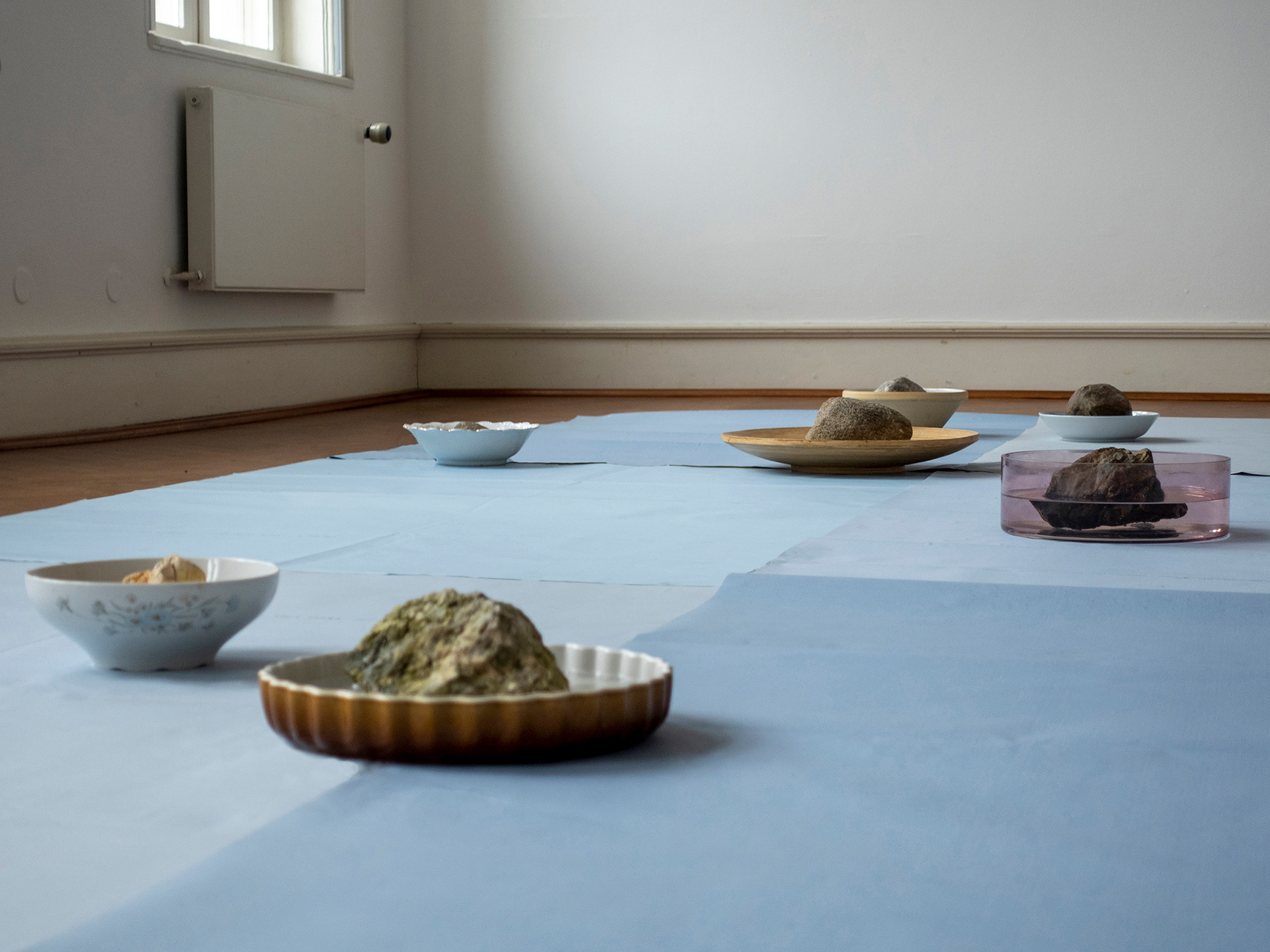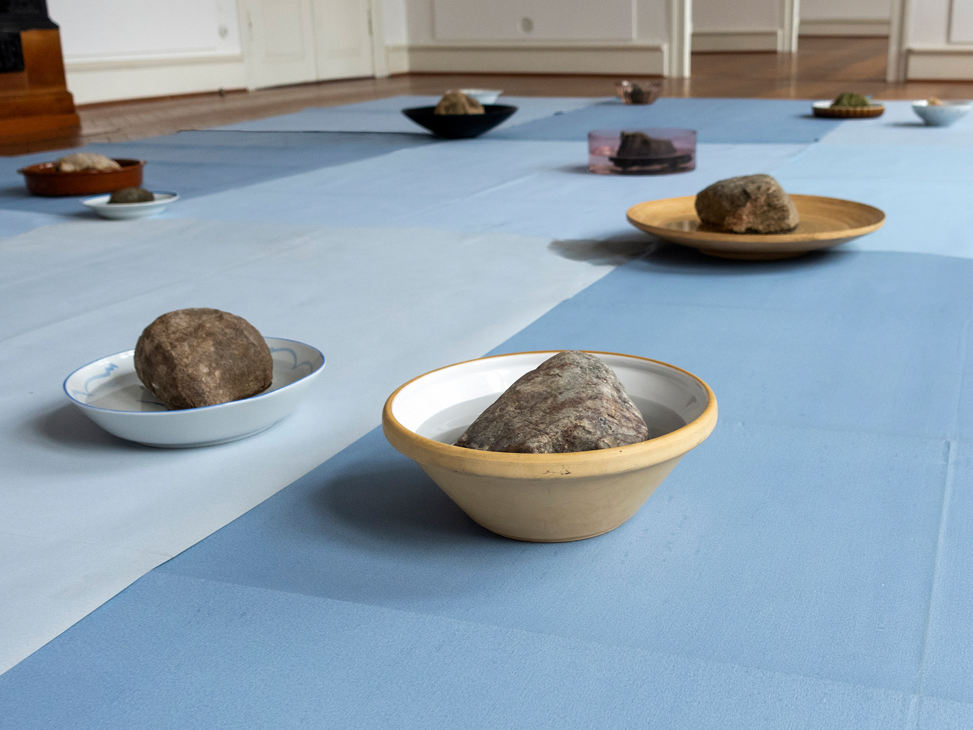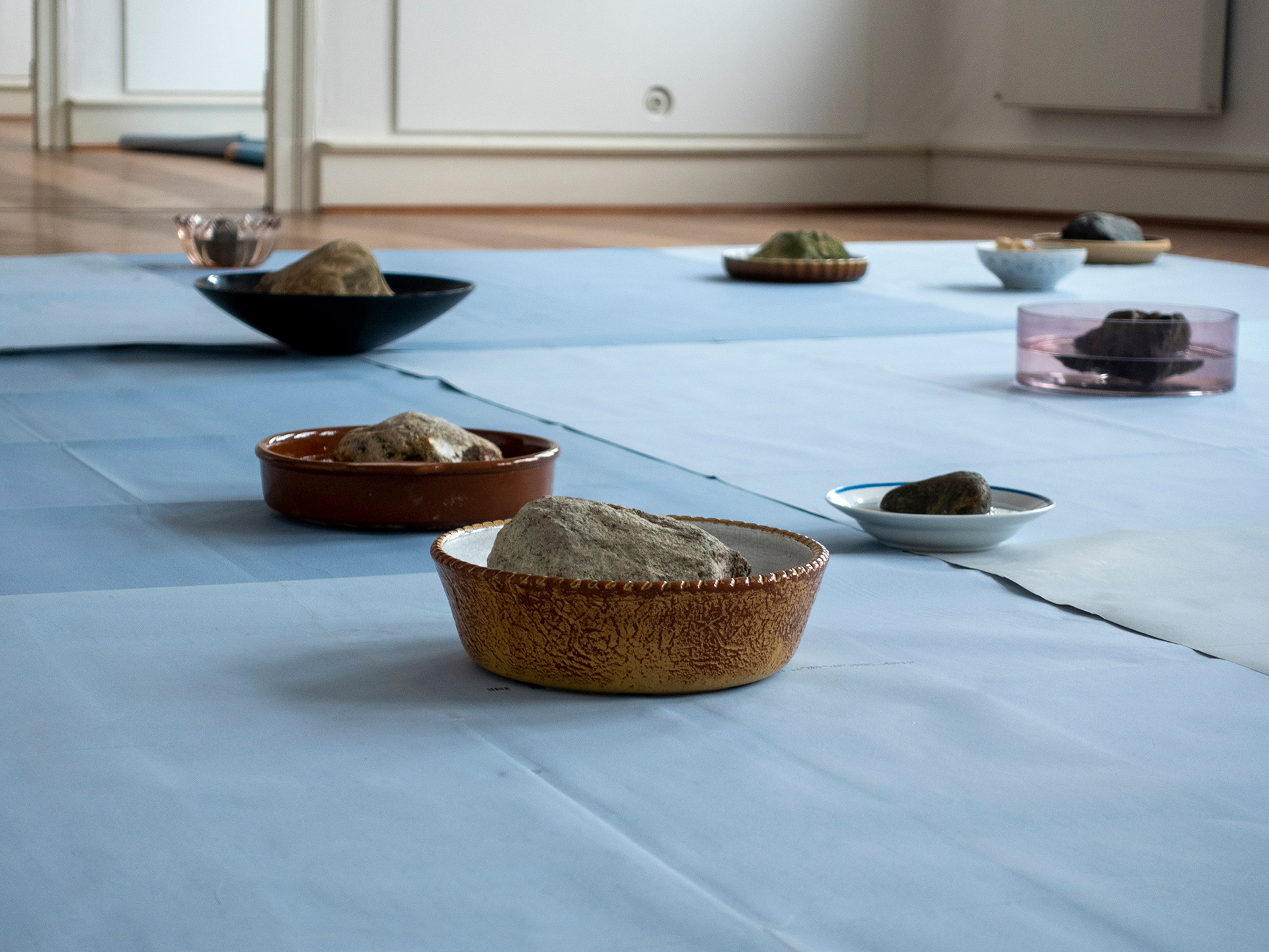 Plates, trays and bowls filled with rocks and water.