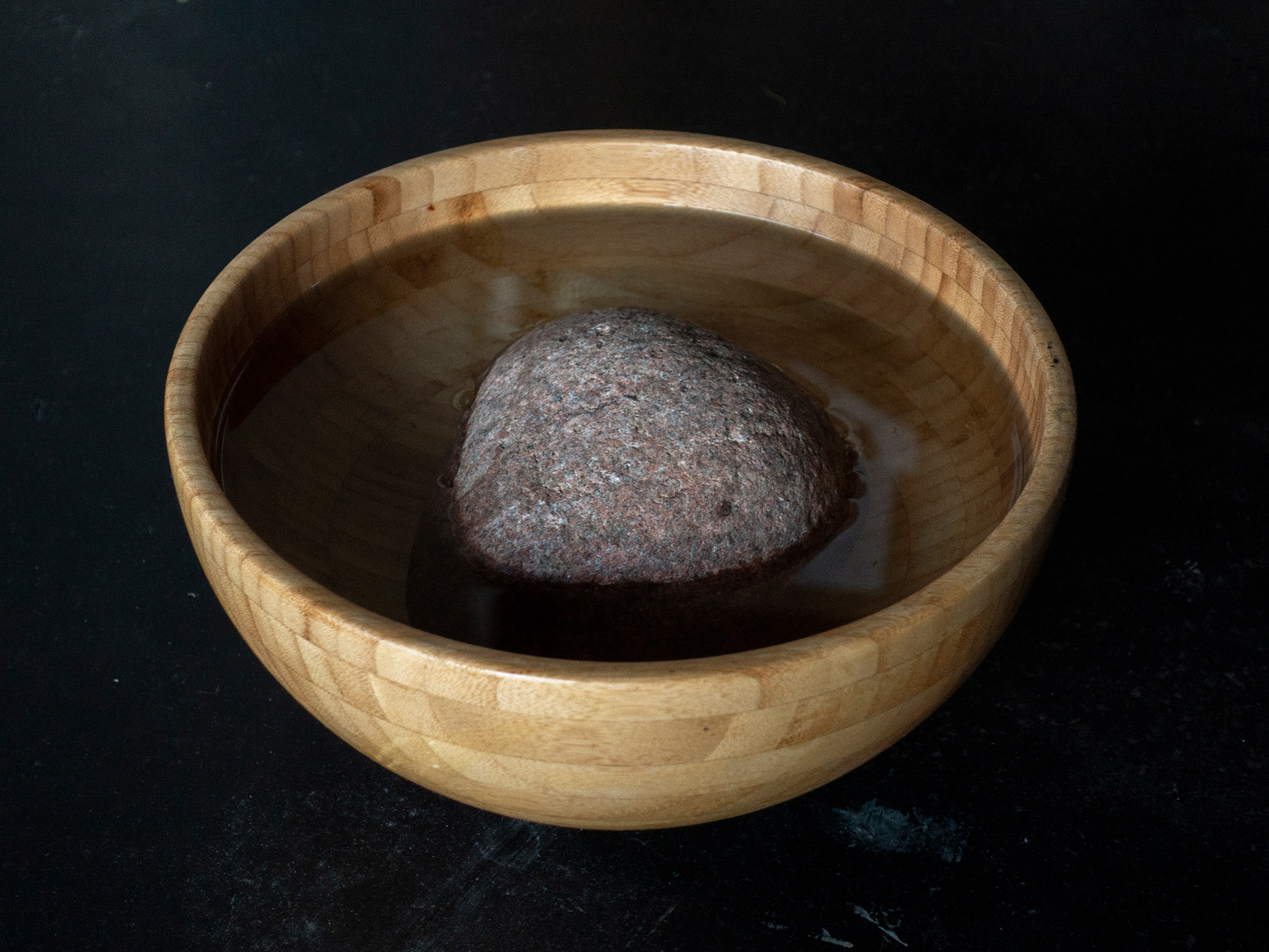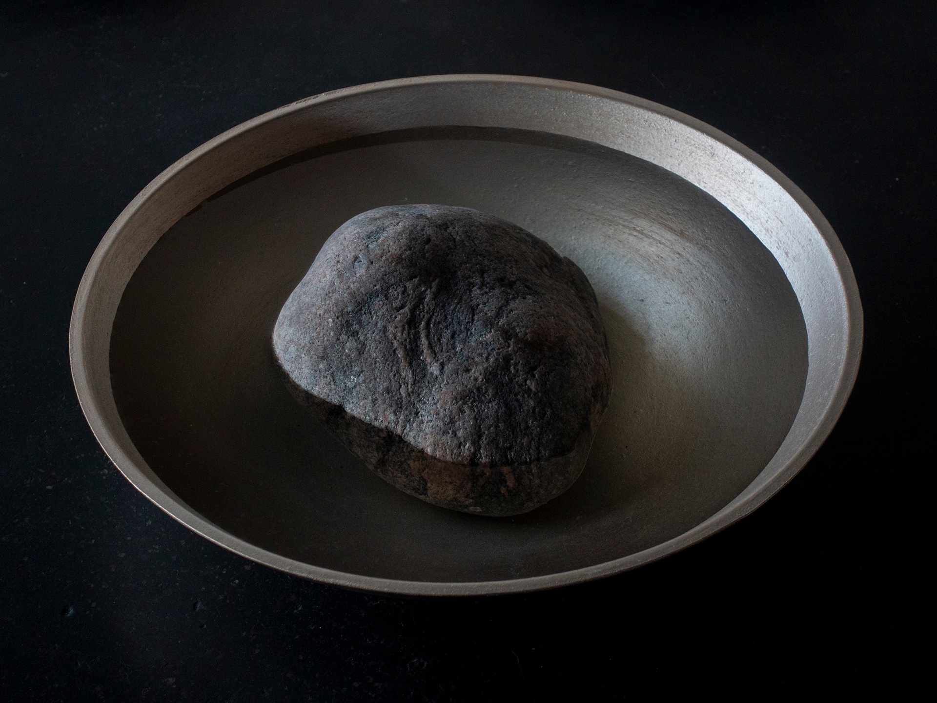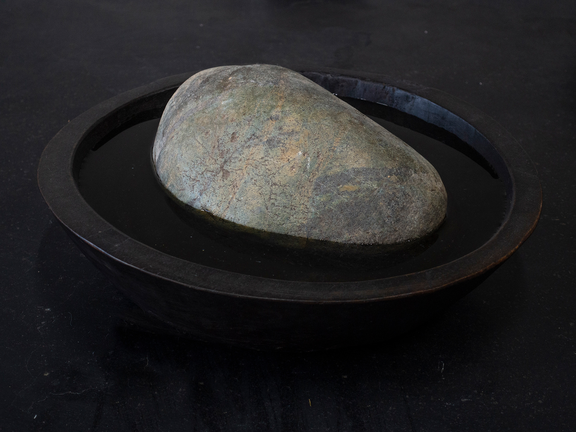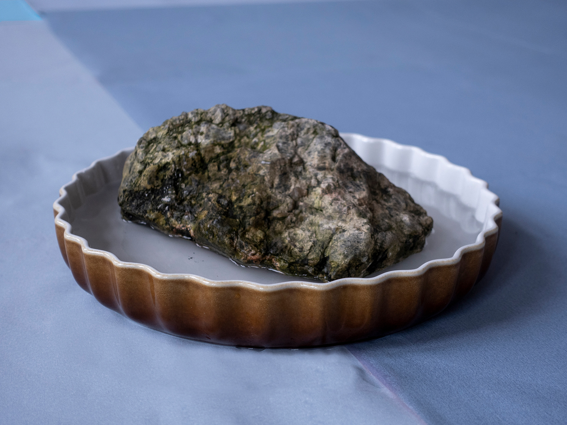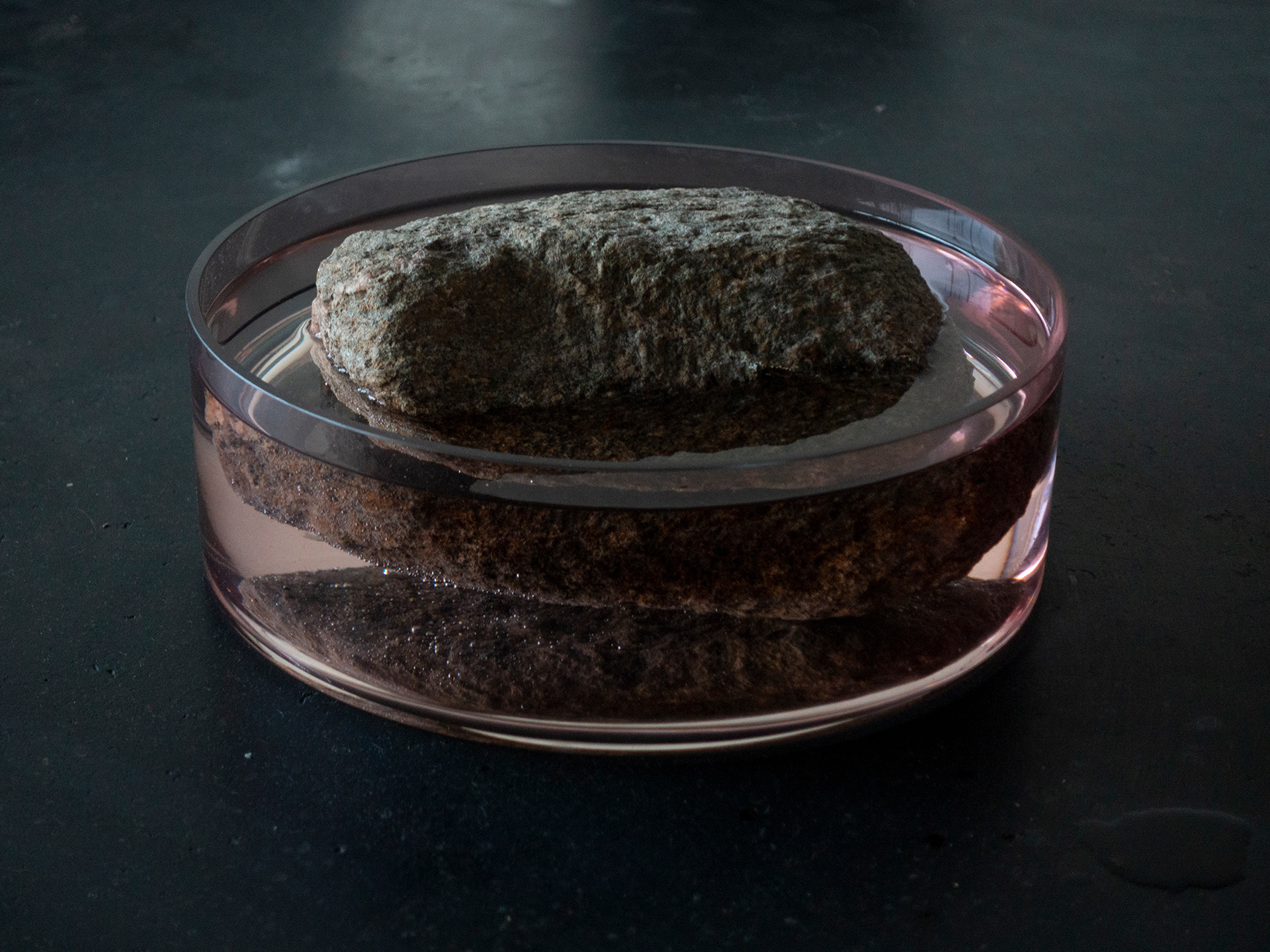 Plates, trays and bowls filled with rocks and water.