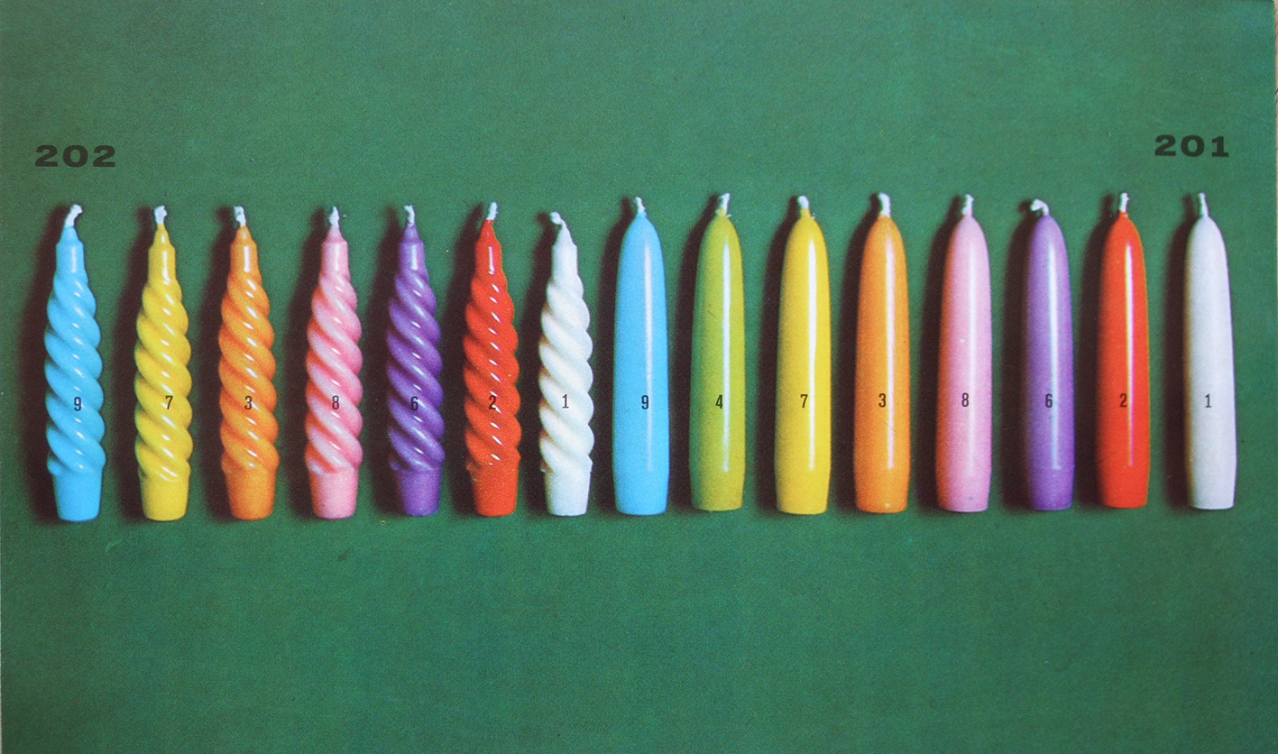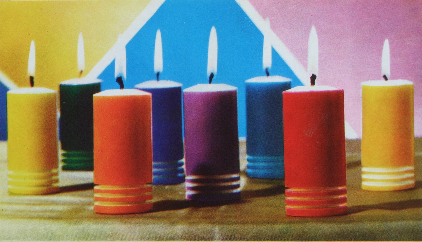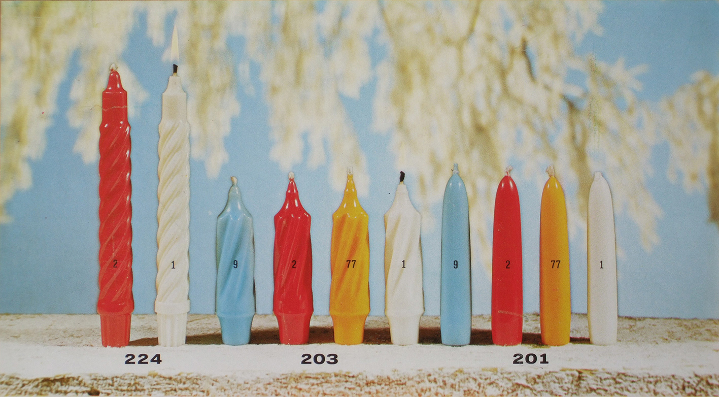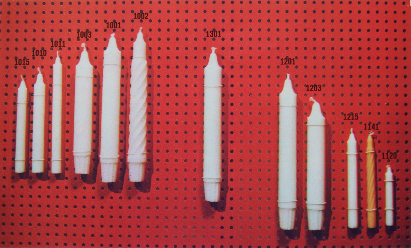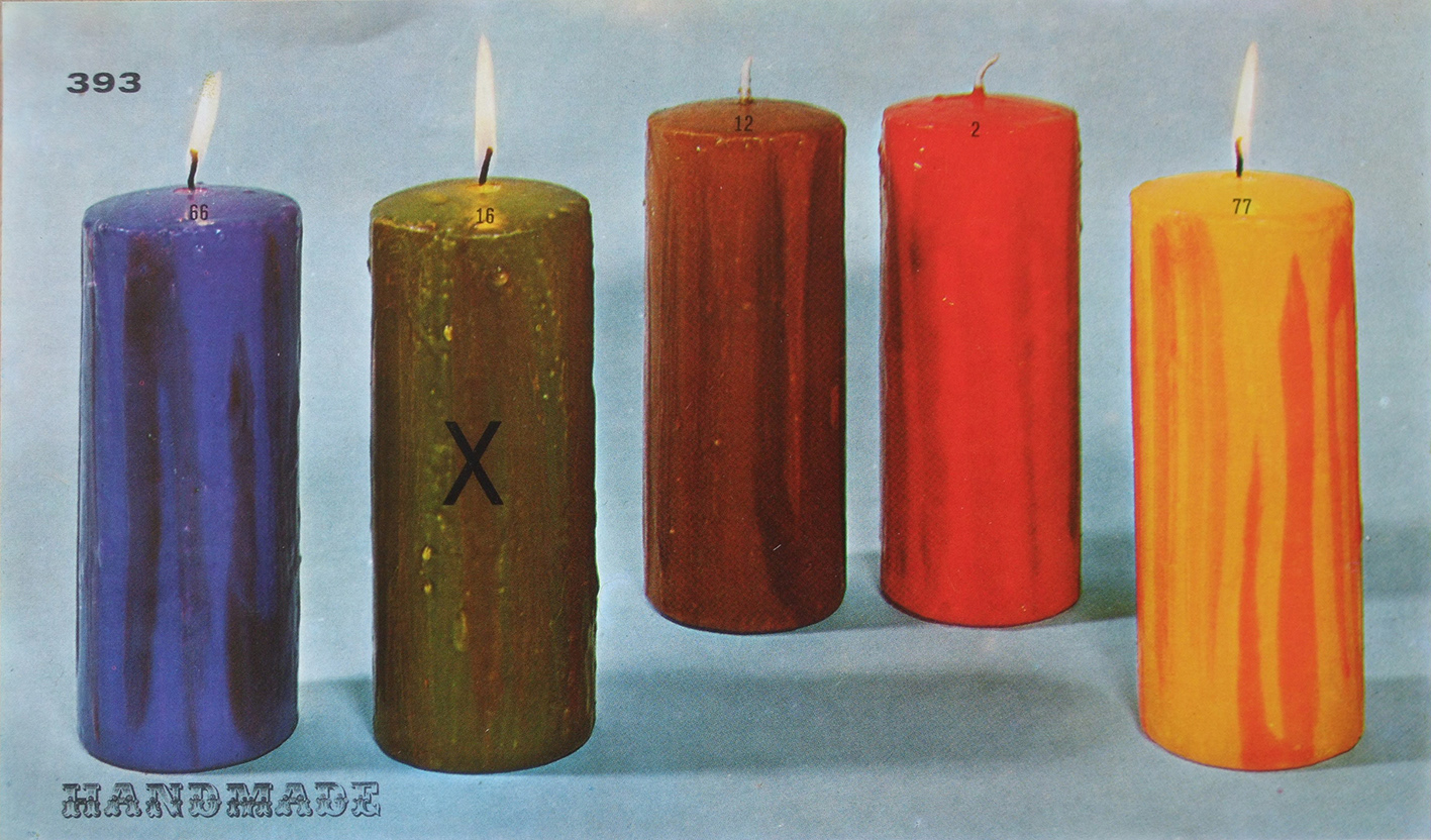 Slide projection of the last product catalogue of a candle factory before it went bankrupt projected through a coat rack in a former barracks building.