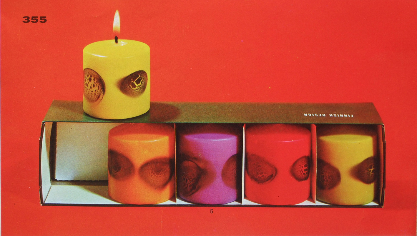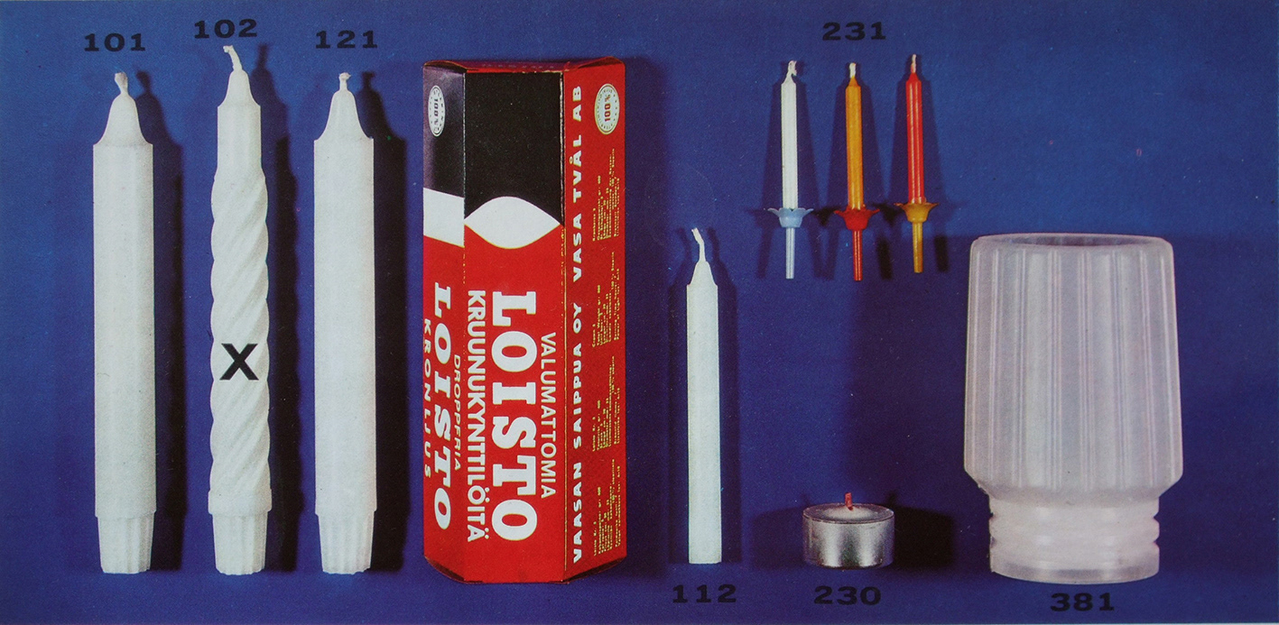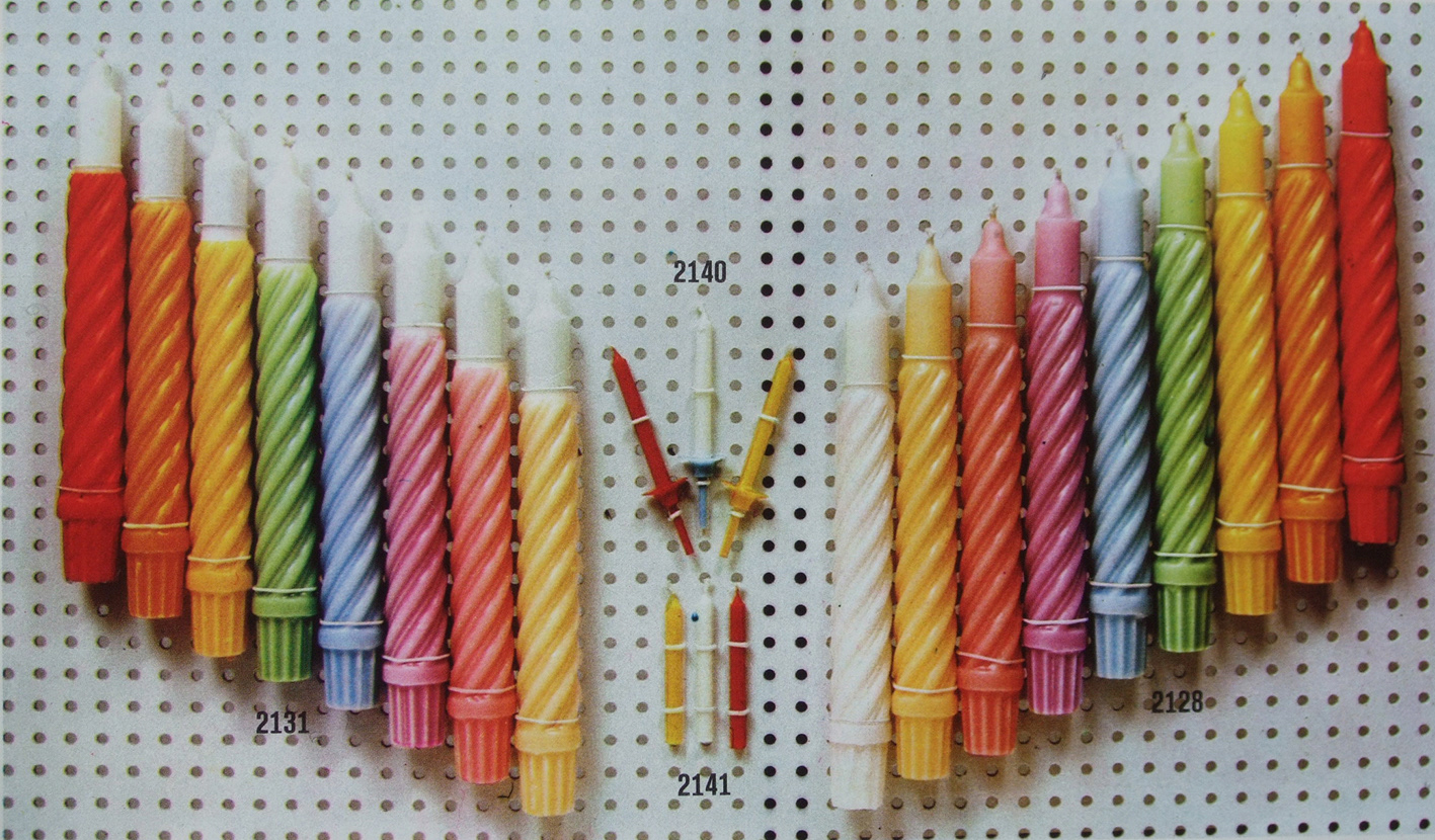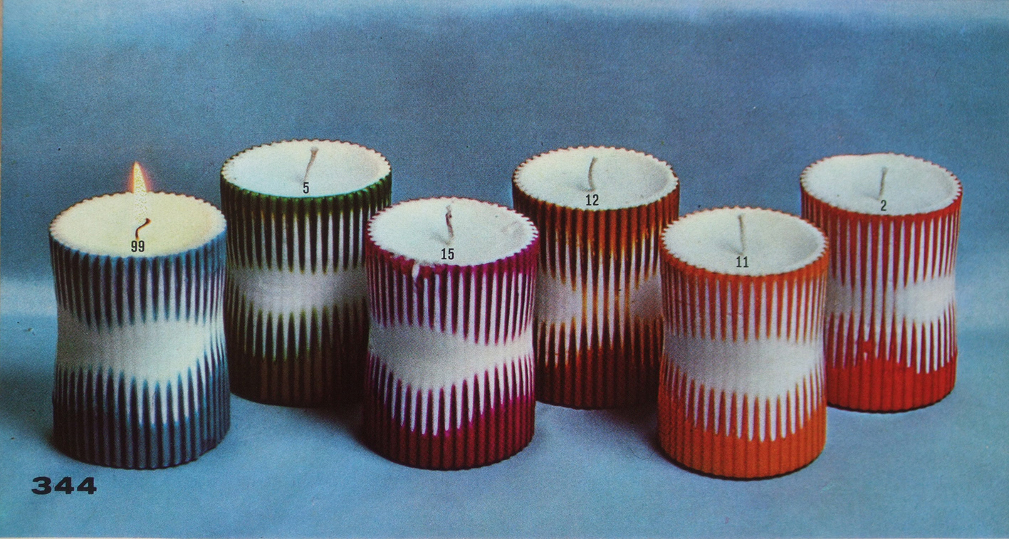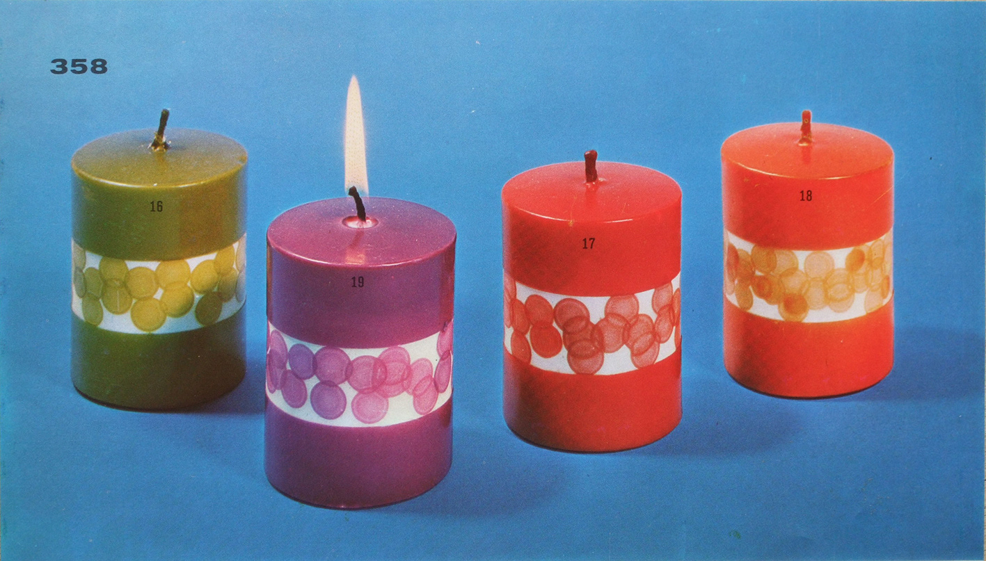 Slide projection of the last product catalogue of a candle factory before it went bankrupt projected through a coat rack in a former barracks building.